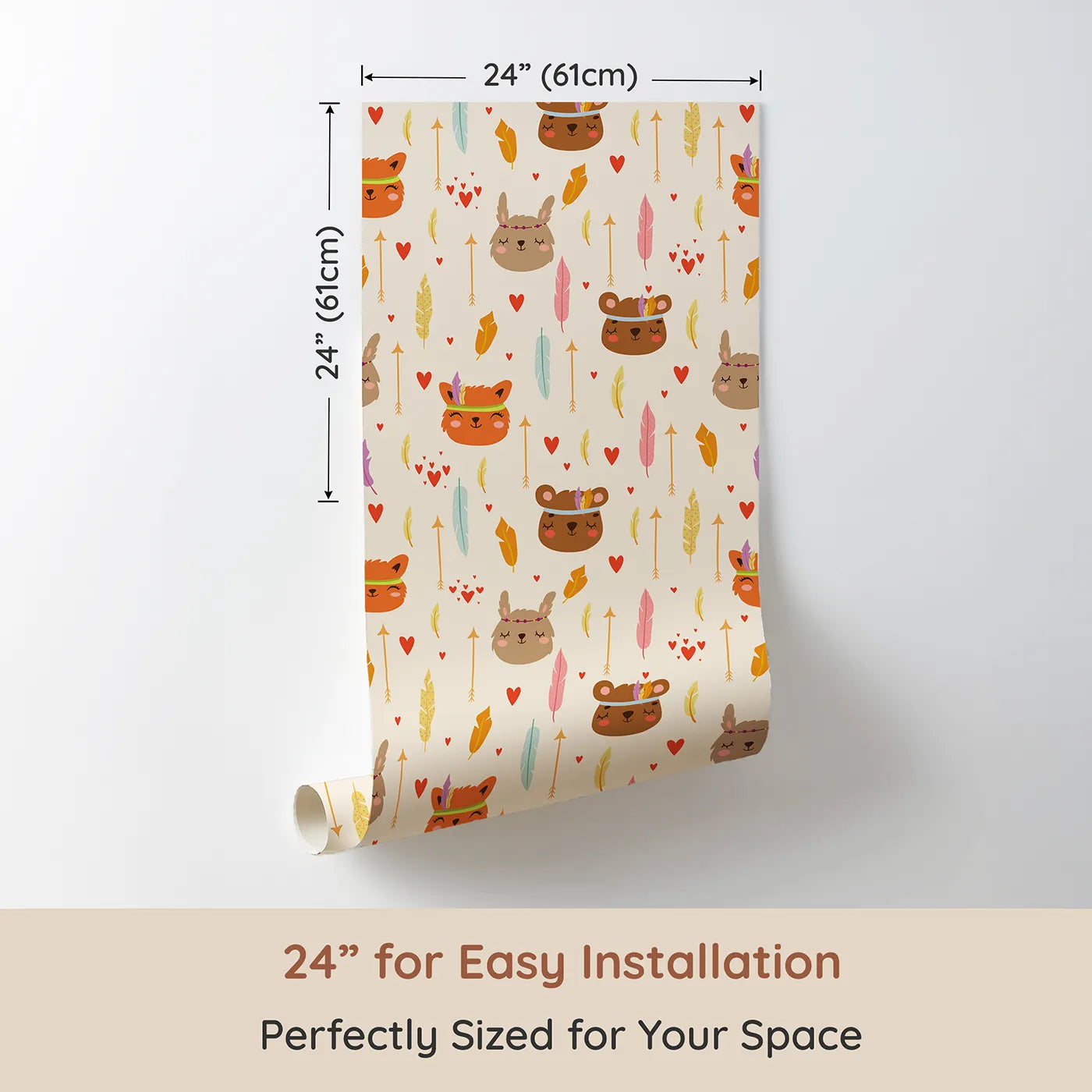 This charming woodland wallpaper showcases sweet animal faces, including a fox and bear, adorned with gentle feathers and surrounded by hearts. The warm vanilla cream background creates a cozy and playful atmosphere, making it a perfect choice for a nursery or playroom filled with imagination and friendship.
