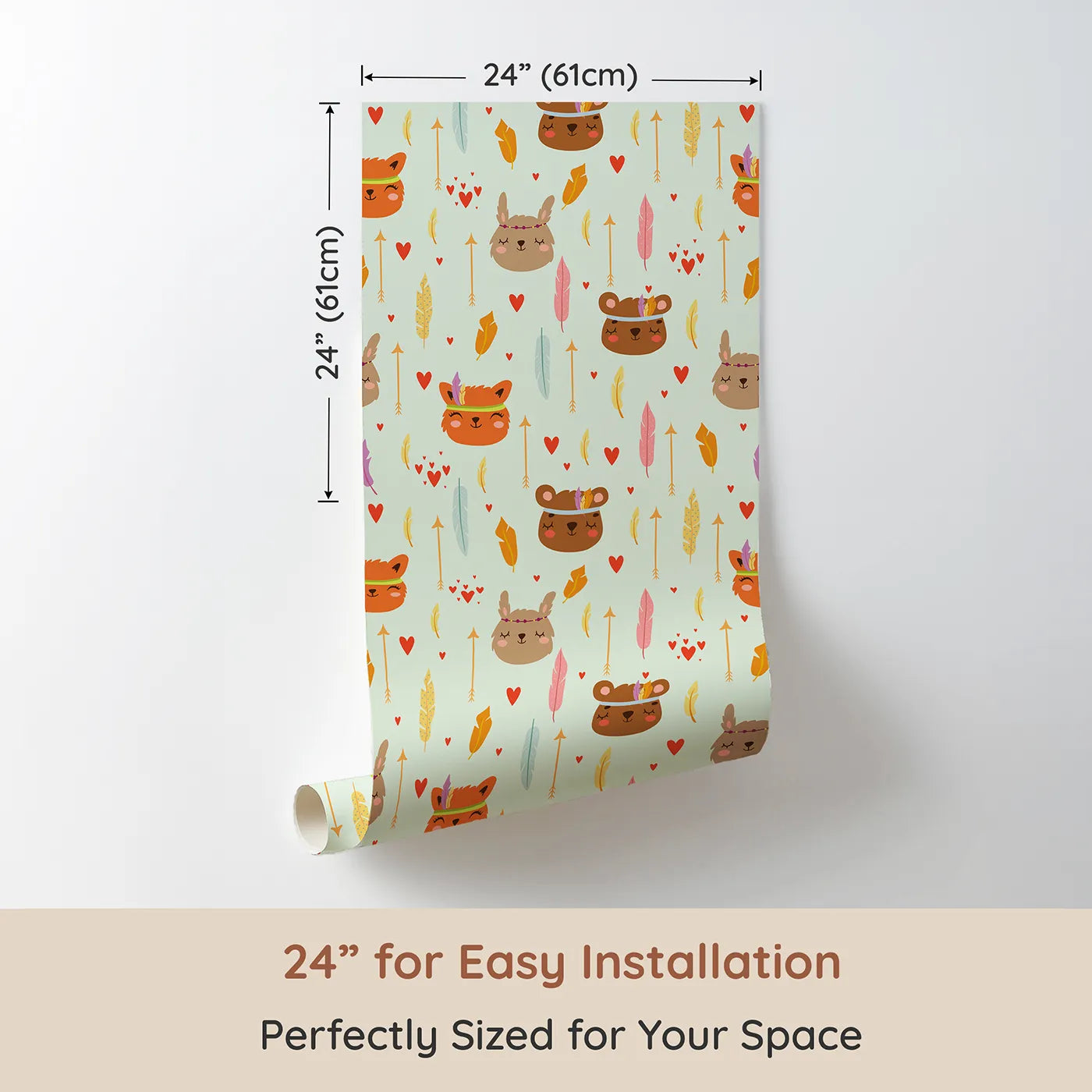 This charming woodland wallpaper showcases sweet animal faces, including a fox and bear, adorned with gentle feathers and surrounded by hearts. The soft mint green background creates a calm and playful atmosphere, making it a perfect choice for a nursery or playroom filled with imagination and friendship.