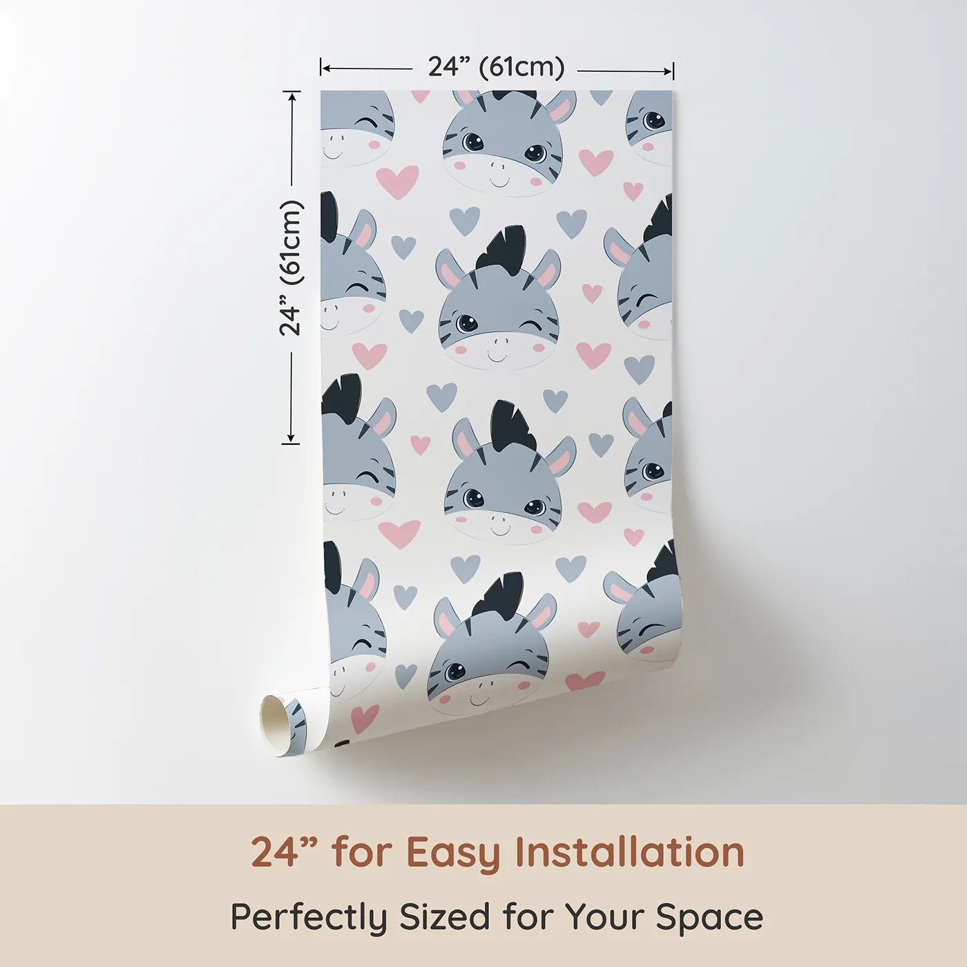 This adorable girls wallpaper features a pattern of winking zebra faces surrounded by soft pink and grey hearts. The sweet and simple design creates a warm and loving atmosphere, perfect for a nursery or a little one's first bedroom. It’s a design that radiates pure happiness.